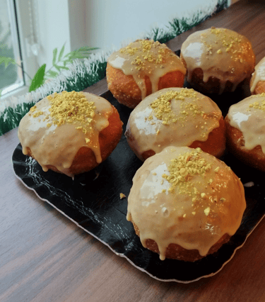 Minkštos spurgos su gaiviu maskarponės ir pistacijų įdaru, aplietos baltojo šokolado ir pistacijų glajumi, papuoštos pistacijų trupiniais